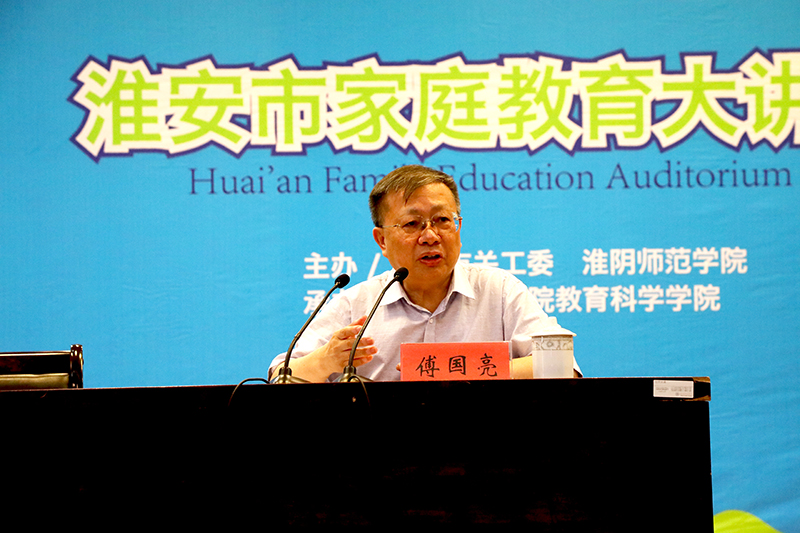 讲座伊始,傅国亮由福禄贝尔的教育理念引出家庭教育的重要性。通过观察中国家庭教育现状,他指出家庭教育是唯一的起始教育、奠基教育,应该让家庭教育从自发走向自觉。针对中小学学生普遍存在的教育焦虑现象,他指出“不要输在起跑线上”是个伪命题,但通过家庭教育培养的良好的习惯、性格、情绪却是一个孩子真正的起跑线。傅国亮通过讲述自身经历将家庭教育不教而教的特点、儿童认知模仿学习的特点娓娓道来,举中国式过马路等典型案例分析父母的言行举止的日常教育对孩子潜移默化的影响。谈及日常生活中儿童说谎、偷东西等现象,他对儿童不同的行为进行分析,并作出正确的教育方式指导,他表示,家庭教育要尤其注重了解儿童思维的特点。
