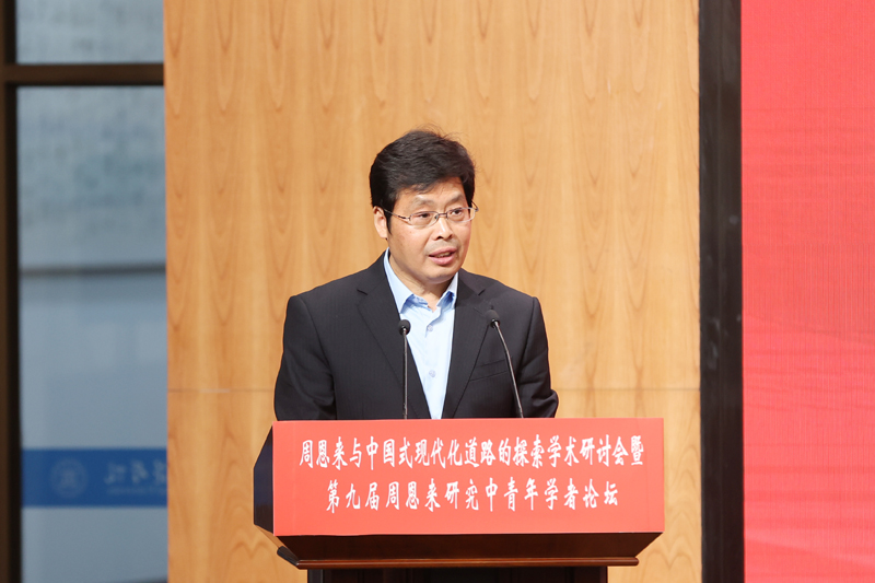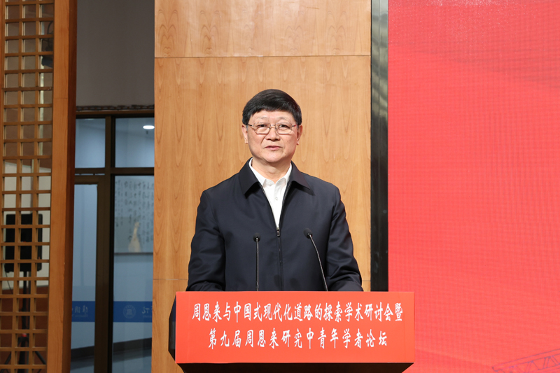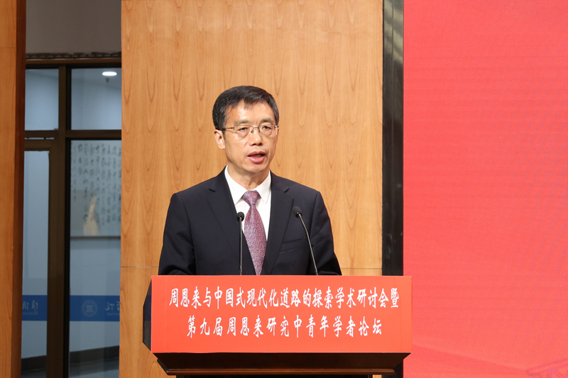 尚洪波致辞。他指出,周恩来是中国社会主义现代化建设的一位主要开拓者和奠基者,在推进中国现代化建设方面积累了丰富的理论和实践经验。系统研究周恩来与我国现代化事业发展的系列问题,有助于更加全面了解我们党探索中国式现代化的艰辛历程,深入理解新时代中国式现代化的理论与实践,对新征程上全面贯彻新发展理念,加快构建新发展格局,以中国式现代化全面推进中华民族伟大复兴,具有重要理论价值和现实意义。尚洪波介绍了学校近年来办学治校、周恩来思想生平研究以及用周恩来崇高精神风范办学育人等方面取得的成绩。他表示,淮师将以本次研讨会为契机,从中汲取营养和智慧,用历史映照现实、远观未来,紧紧围绕立德树人根本任务,做周恩来崇高精神风范的积极传承者和模范践行者,牢记嘱托、感恩奋进,培养拥有“四个自信”的时代新人。