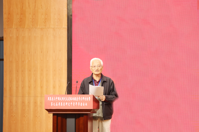 胡金波在讲话中指出,周恩来是我们党探索中国式现代化的决策者、实践者、推动者,为中国式现代化作出了毕生贡献。本次研讨会暨中青年学者论坛,对于回顾周恩来对中国式现代化道路不懈探索的历程,探讨如何更加自觉地传承弘扬周恩来崇高精神风范,更加坚定地以中国式现代化全面推进中华民族伟大复兴具有重要意义。胡金波以“中华崛起与道路探索”为题,从“少年立志,倾情寻求中华崛起的现代化道路”“坚定不移,着力构筑新中国现代化制度根基”“求真务实,潜心描绘适合国情的现代化蓝图”“尊重自然,共产党人决不能成为历史的罪人”等四个方面作主题报告。胡金波强调,我们要深入分析周恩来对中国式现代化道路艰难而执着的探索与杰出贡献,加深对周恩来等老一辈革命家的研究,向历史寻经验、向历史求规律、向历史探未来,更加坚定地向着现代化目标迈进,迎来伟大复兴的光明前景。