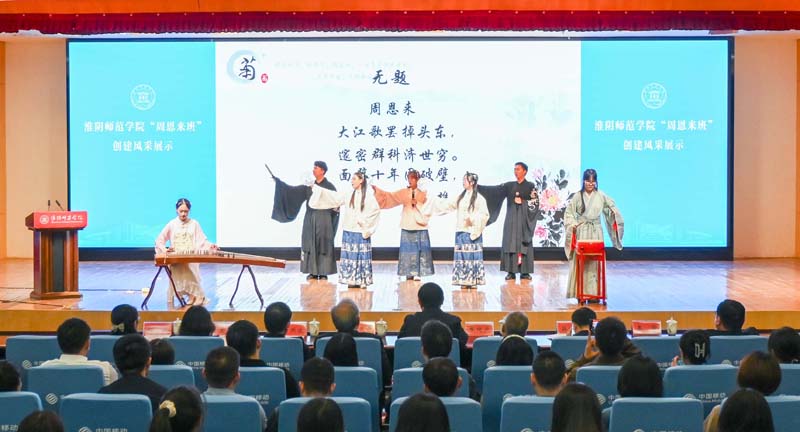 第二十二届“周恩来班”化学化工学院1901班、第二十三届“周恩来班”美术学院1906班、第二十三届“周恩来班”提名奖班级数学与统计学院2004班、文学院2001班现场分享班级的创建之路,同学们的成长故事。新闻与传播学院2202、2302等共建班级、音乐学院2207班作“周恩来班”创建学习成果展示,话剧《为中华之崛起而读书》,舞蹈《海棠花祭》,同学们以自己的方式传诵着周总理的感人事迹,讲述着淮师学子与周总理的故事。