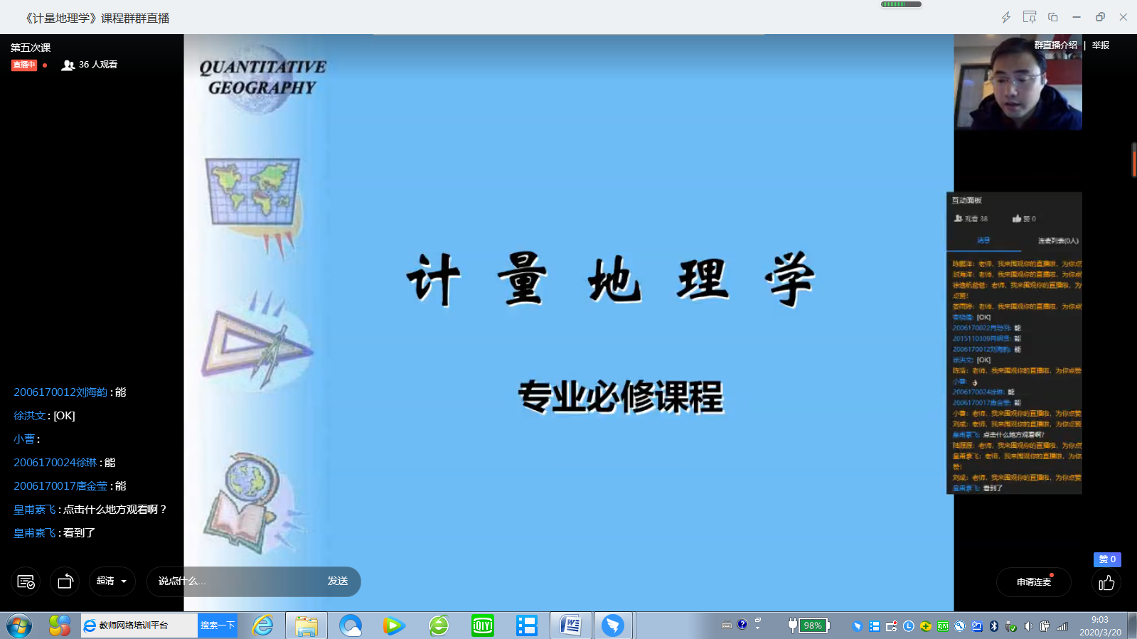 文学院刘志刚、城环学院曹蕾、美术学院徐文杰、体育学院高彩暇、传媒学院李德顺、历史学院王亚辉、音乐学院唐振华等老师则通过钉钉视频直播、微博直播、哔哩哔哩直播和QQ语音授课的方式开展教学。老师们教学基本功扎实,课堂生动有趣,精神饱满,教学目的明确。本次活动中所有的授课教师都强调“互动与问题导向式”的教学方法,课前提供学生PPT与相关材料让学生提前预习,课堂上注重与学生互动讨论,充分做到了“教学内容不缩水、教学标准不降低,教学效果看得见”。