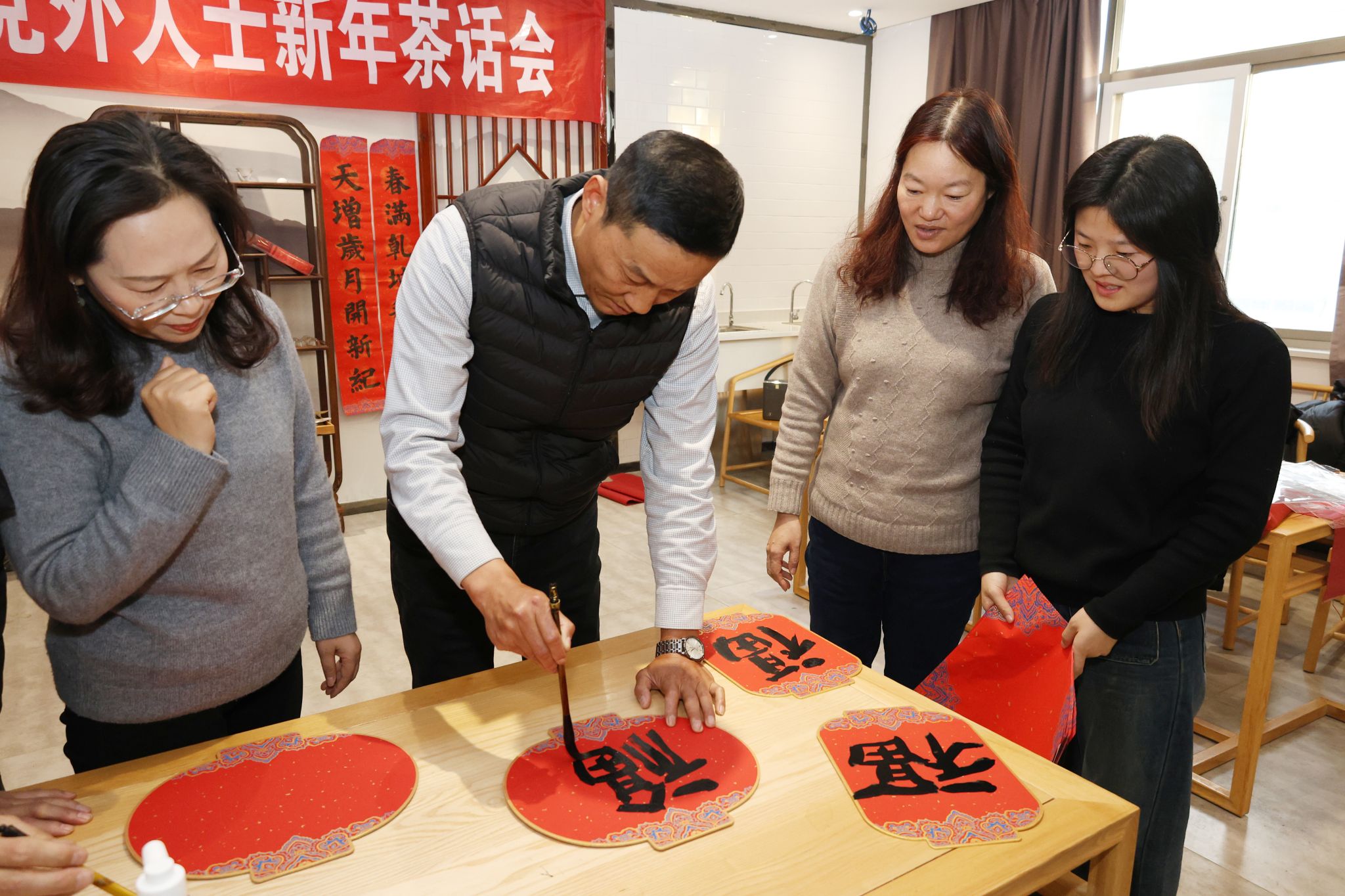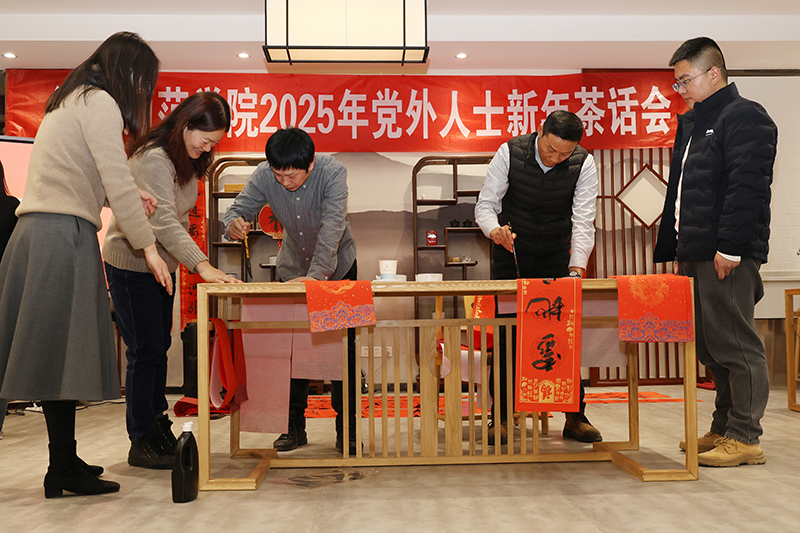 民盟淮师基层委员会漆济明老师和民进淮师总支贾砚农老师挥毫泼墨,现场书写了一副副寓意吉祥的春联,为大家送上了新年的美好祝福。