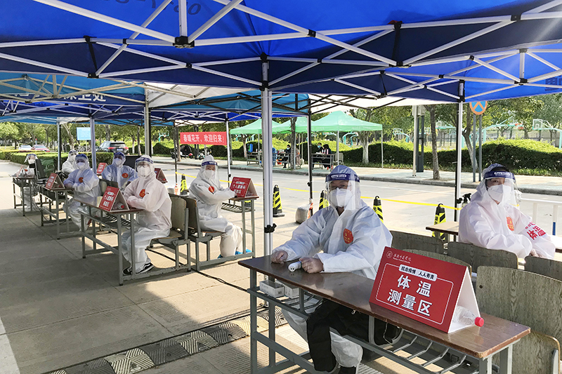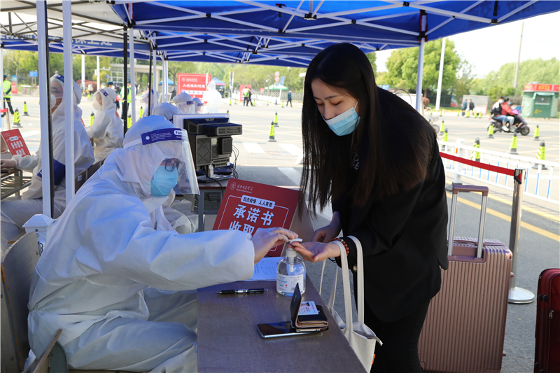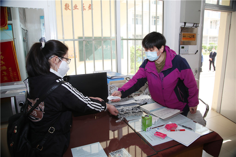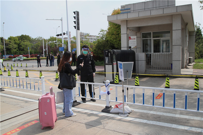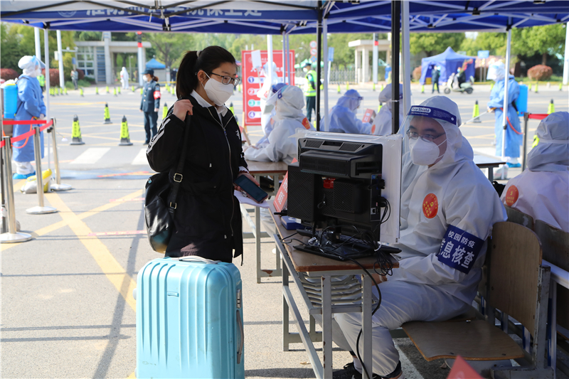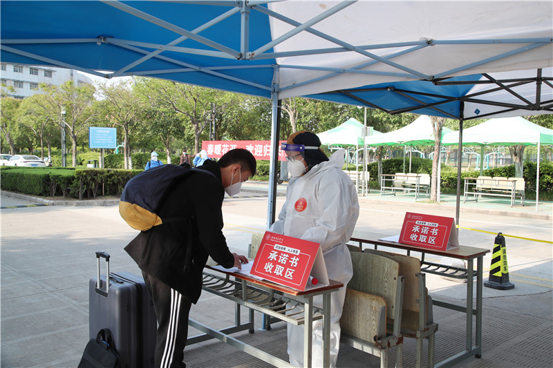 在返校报到点,同学们按照工作人员现场指挥,佩戴好口罩,保持1米以上距离有序排队,依次进行体温测量、健康码查验、报道信息核验、消毒,符合要求者进入健康信息登记区登记,提交健康承诺书。进入宿舍区前,宿管工作人员为返校学生再次测量体温、核实宿舍信息、办理入住登记,并向同学们发放校园临时通行证、体温计、防护指南、84消毒液等物品。