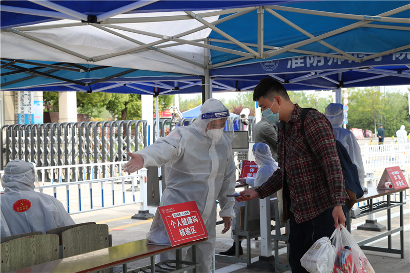 图为学生扫描淮上通或苏康码。记者 唐瑀 摄