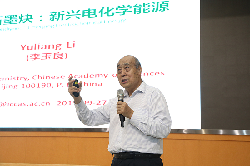学术报告会上,李玉良院士介绍了化学与材料的变革在推动人类文明进程中的作用,图文并茂地介绍了碳材料中的新成员——二维碳石墨炔,并详细地讲解了石墨炔在新兴电化学能源中的应用,让同学们直观地感受到二维碳石墨炔材料的魅力。李玉良院士表示,通过对功能分子材料的设计和聚集态结构的研究,调控纳米尺度下材料的结构和能级,实现了在生长过程中有效地调控材料物理和化学性质,得到了性能优异的析氢器件、锂离子电池及太阳能电池,完成了多个首次突破,在国际上产生了重大学术影响。