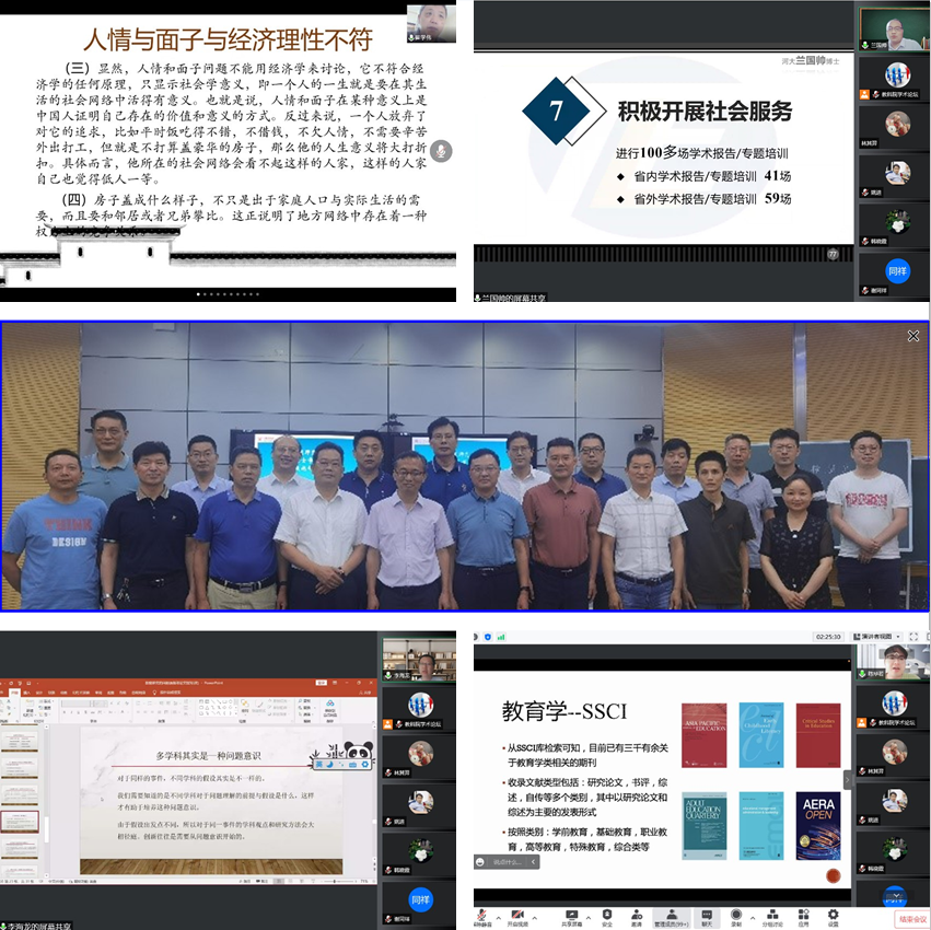 主会场共举办7场线上学术报告。南京大学博士生导师、长江学者翟学伟教授开设了“论中国人的人情与面子”学术报告;河南大学兰国帅博士、扬州大学李海龙博士、南京师范大学陈华若博士,分别分享了“高级别课题项目申报与研究团队建设:方法攻略与落地实践”“教育研究的问题选择与论文撰写”和“教育学科中的SSCI:选题、写作与投稿”讲座;本院老师林其羿、杨绪辉和姚进分别开设了“C刊发表困局的SSCI发表破解之路”“教育技术学研究的三重透视:缘起、范式和共同体”和“质性数据分析方法——NVIVO的使用”学术报告。