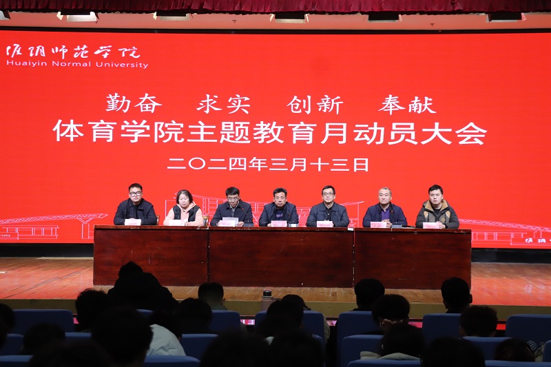 淮师新闻网3月14日电(记者 颜超龙)3月13日晚,体育学院在图书馆学术报告厅举行“勤奋 求实 创新 奉献”主题教育月动员大会。院党委书记陆林召、院长蔺新茂、党委副书记周翔,全体辅导员、班主任、体育学院全体在校学生参加大会。会议由副院长柏建清主持。