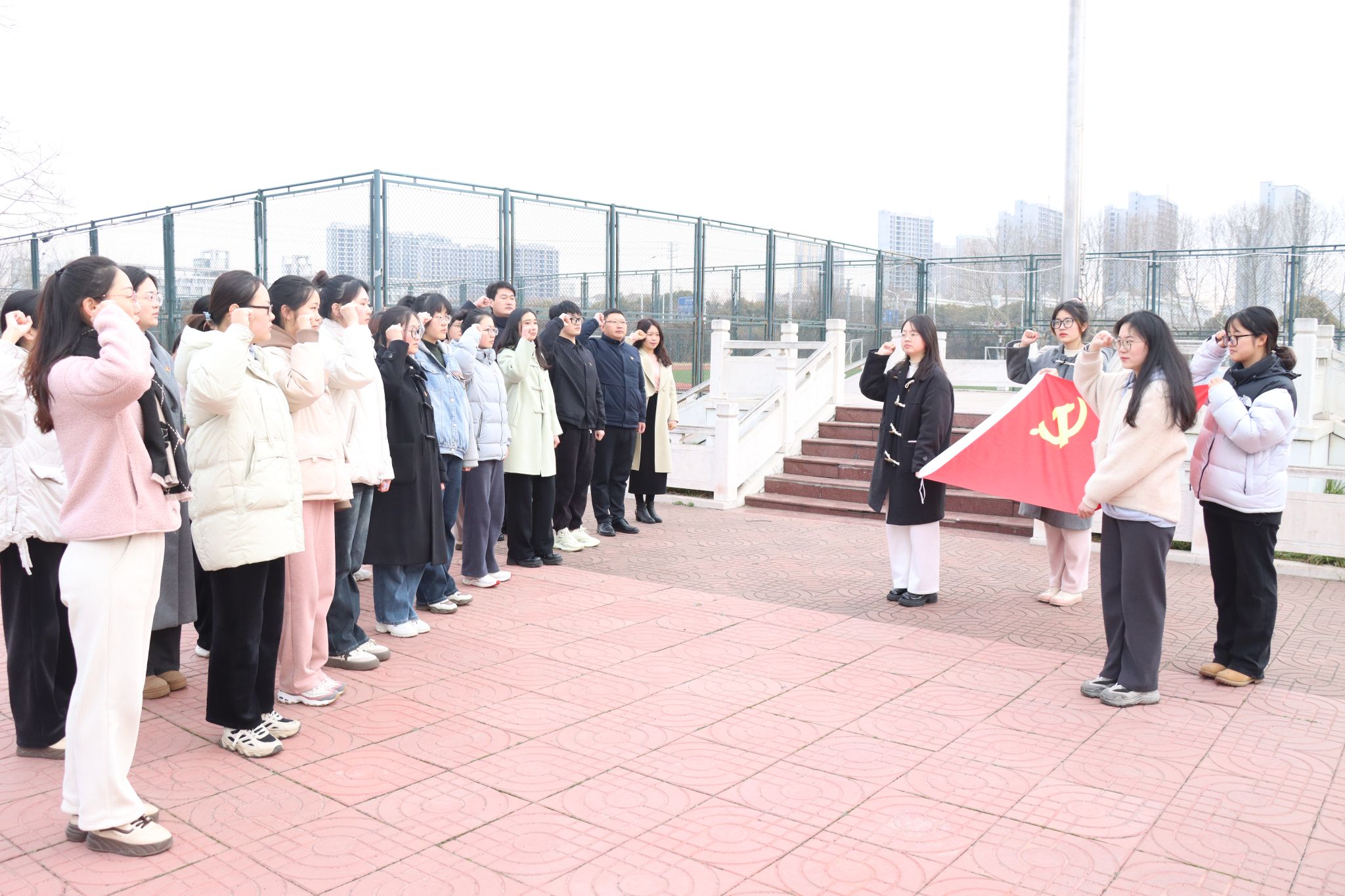 管婷婷为2021级新党员佩戴党徽。大家列队整齐,紧握右拳,目光坚定,面向鲜艳的党旗进行入党宣誓。
