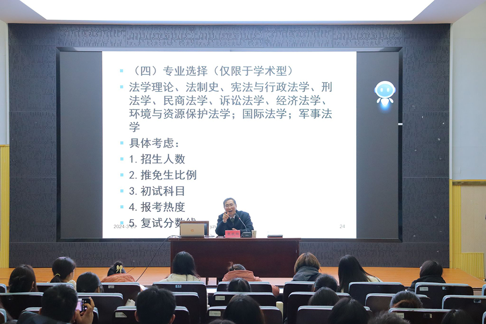 张毅辉将自己从教40多年来积累的考研指导方面的经验向同学们做了分享。张毅辉指出,考研既是当今社会发展的需求,也是学校发展的需求,更是个人深化专业知识、拓宽视野、提升综合素质的重要途径。张毅辉老师通过分析历年法学考研录取数据,指出当前法科考研竞争激烈现状和院校要求之间的差异,强调要坚持考上为王的原则,理性确立报考地区与院校。他表示,同学们当前最重要的是立即行动起来,不要陷入择校焦虑。从现在开始,立即投入到公共课、专业课的学习中,并对英语、政治、专业课程的学习规划与时间安排进行了细致指导。分享会结束后,张毅辉将亲自整理的考研指南赠予法学院,并表示期待与法学院加强考研沟通交流。