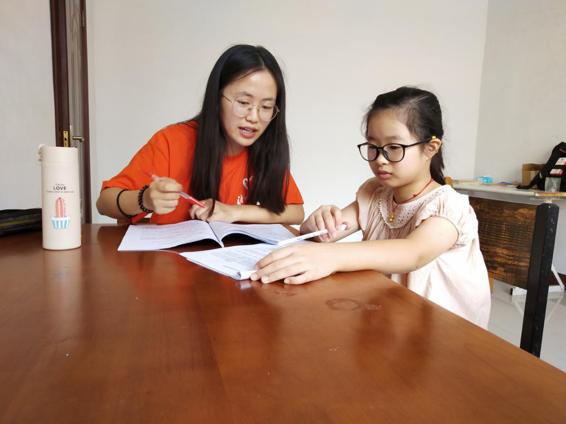 团队发挥分散实践的优势,鼓励师范生利用专业知识帮助留守儿童。李可欣、戴婷、刘佰畅等团队成员主动为乡村留守儿童提供一对一或一对多课业辅导、爱心陪护。尽全力辅导留守儿童的作业,和孩子一起巩固知识,攻克难题,让孩子拥有一个充实有意义的暑假。