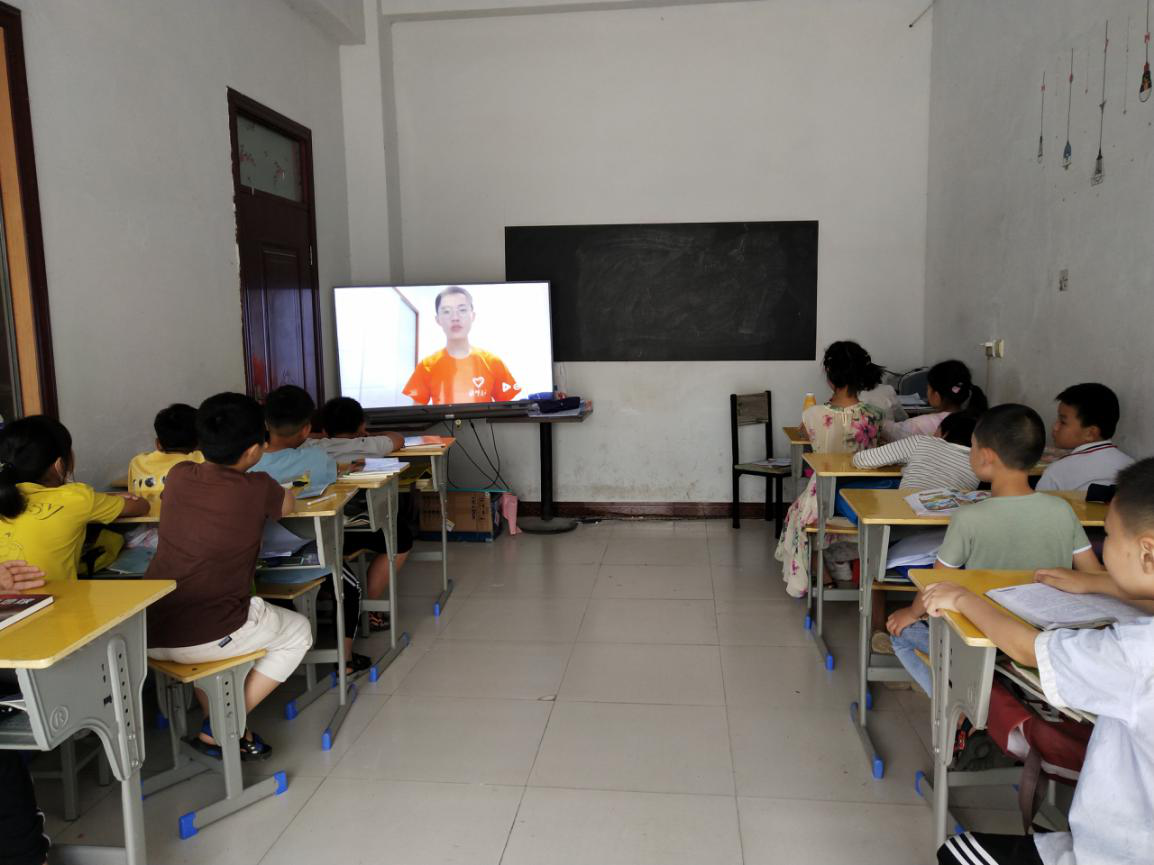 图为团队成员向乡村儿童讲述总理故事、介绍总理事迹、观看总理短片现场。