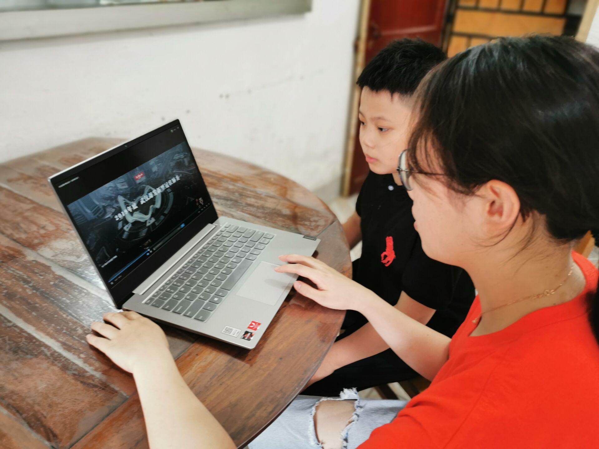 图为团队成员与儿童共同观看抗“疫”纪录短片现场。